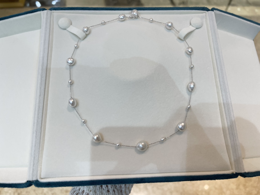 Keshi pearls of various sizes and shapes are intricately combined to create a personalized star necklace, producing a patchwork visual effect that enhances the wearer's overall fashion appeal.